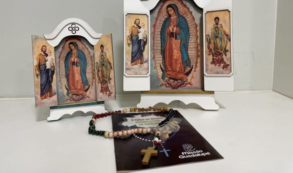 Uma Capelinha de Guadalupe mostrando a Imagem perfeita desta Senhora, algumas cópias do folheto e um “Terço da Bênção”, que é criação da Missão Guadalupe, para ajudar na reza. Ele apresenta uma cor diferente em cada dezena a fim de lembrar e recomendar, em cada uma delas, uma categoria de pessoas muito sofridas, que precisam de oração e que podem, inclusive, estar presente em nossas famílias.